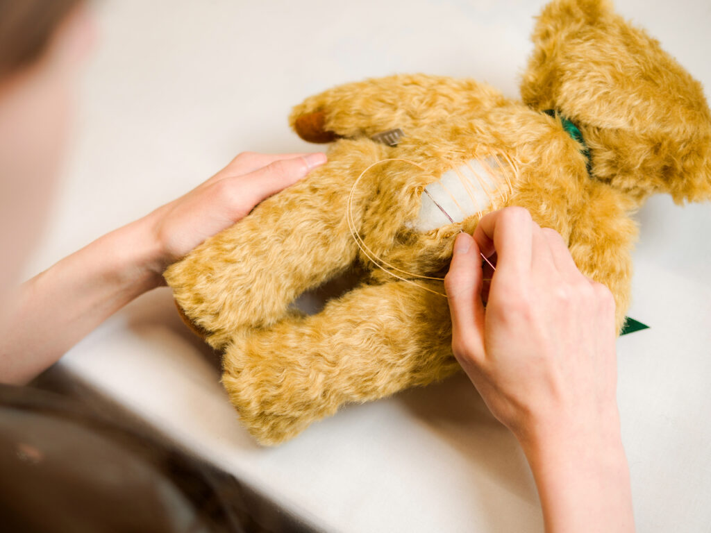 After care is taken to fill the soft toy to an optimum weight using certified recycled fibre, it is then ready for the finishing touches; a carefully hand-embroidered nose and smile, a thorough brush and trim, and a neatly tied bow or accessory.