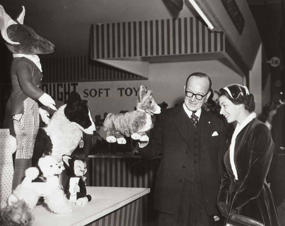Her Majesty The Queen presented with a specially-made Merrythought Corgi soft toy in the 1950s.