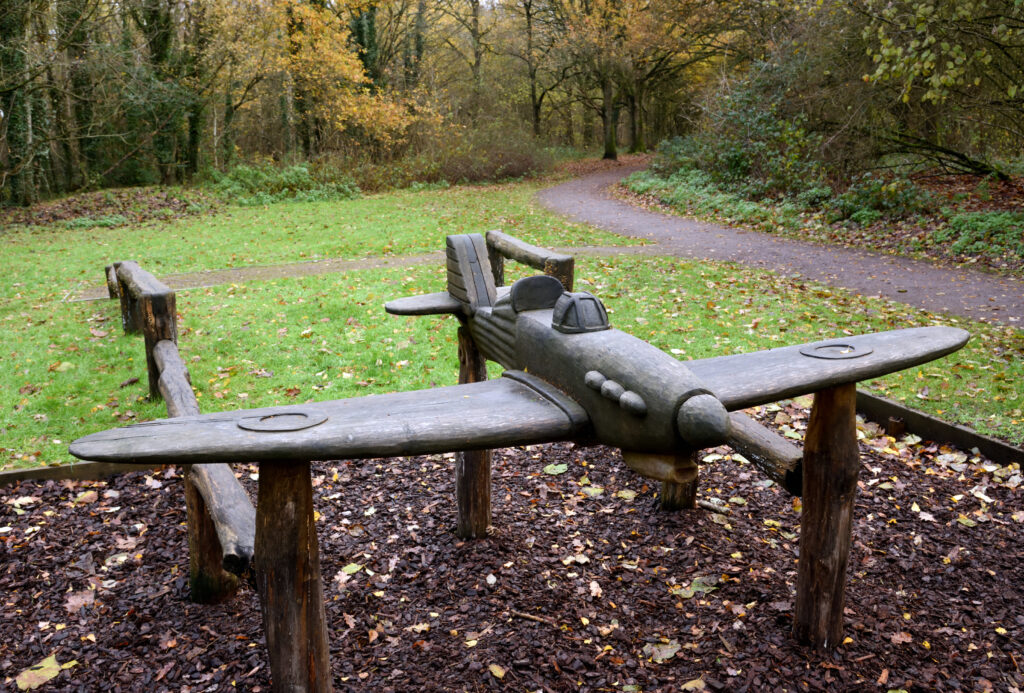 The trail features sculptures created by artist Anthony Hammond, that interpret the history and natural wonder of the park. It includes a carved oak Hawker Hurricane plane and two balance beams. There is a splayed tree known locally as the Octopus with carved oak props – one shows a shipwreck with a sea monster, the Kraken, another picks out different leaf motifs and several props illustrate little fairy houses to honour local stories.